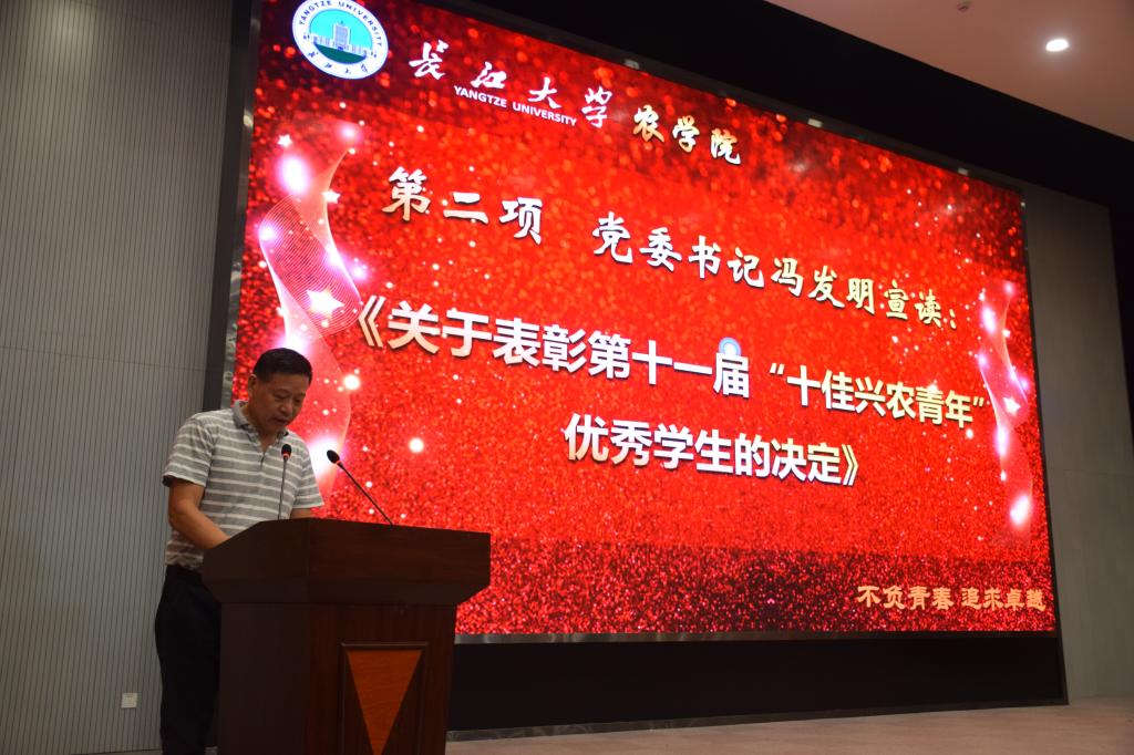 党委书记冯发明宣读表彰文件,向荣获第十一届“十佳兴农青年”荣誉称号的同学们表示祝贺。冯发明寄语十佳兴农青年:“要珍惜荣誉、再接再厉、当好表率、发挥示范引领作用。”同时,他勉励广大同学要坚持以学为主,全面发展,努力成为创新、创业型的农业高级人才。颁奖嘉宾为十佳兴农青年颁发荣誉证书并合影留念。