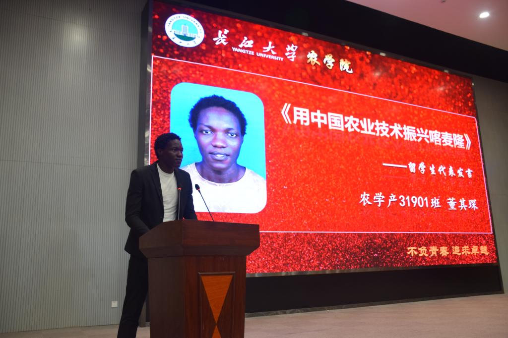 “我不能忘记那些每天吃不饱饭的孩子,我希望以后能帮助实现解决饥饿。”留学生代表,来自喀麦隆的董其琛 Pavel 同学讲述着自己来到长大学农的初心,并勉励在场所有同学能够为了家人、老师更为了自己,能好好学习努力拼搏,实现自己心中的农业理想。