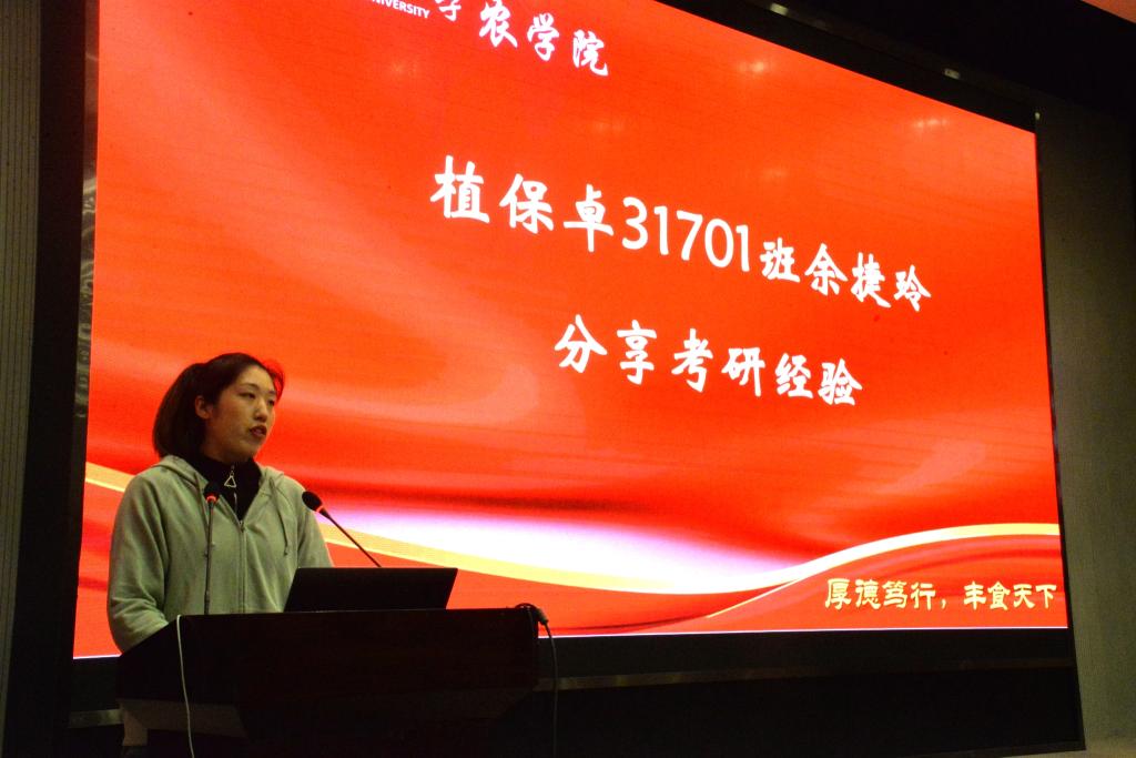 随后,由报考了西南大学的植保卓31701班余捷玲和保送本校的种科31701班江冰为同学们分享了学习方法和经验,余捷玲她鼓励正在考研路上艰难行走的人一定不要就此低头、轻言放弃,建议同学们在备战考研路上找一个研友相互鼓励,相互监督。江冰她希望同学们考研目标要明确,学习计划要可行,学习方法要得当,选择院校要切合自己实际。