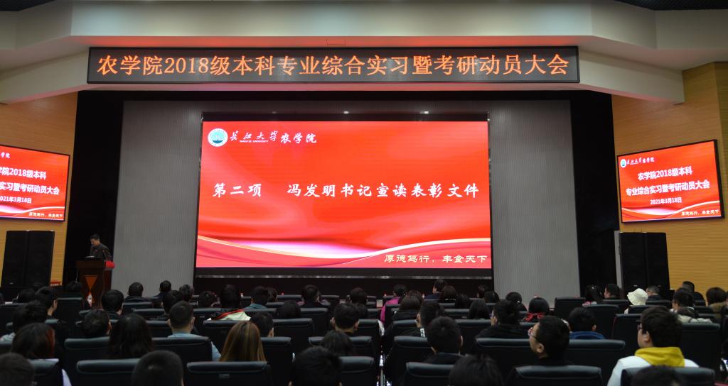 通讯社讯(学生记者 黄俊杰/文 刘思慧/摄)为增进学生对专业综合实习的认识,提高学生考研积极性,树立考研深造的信心。3月18日晚7时,我院于农科大楼1058报告厅举行2018级本科专业综合实习暨考研动员大会。学院党委书记冯发明副教授、副院长张文英教授、副院长方正武教授,两名专职辅导员代表、2018级和2019级全体班主任老师与本科生,团委学生会2020级全体干事参与了此次大会,会议由院党委副书记谭亮魁主持。