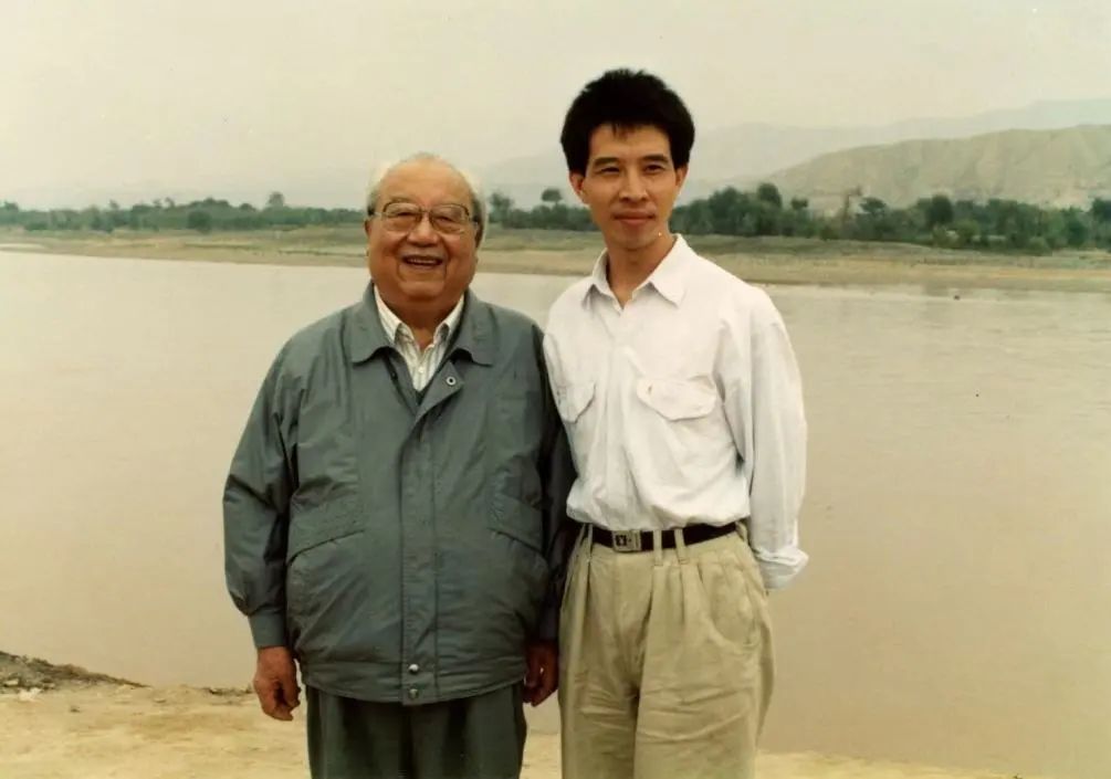 1992年秋,作者与费孝通先生摄于调研途中(甘肃省景泰县黄河边)。