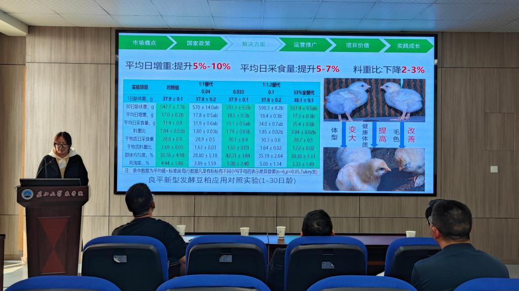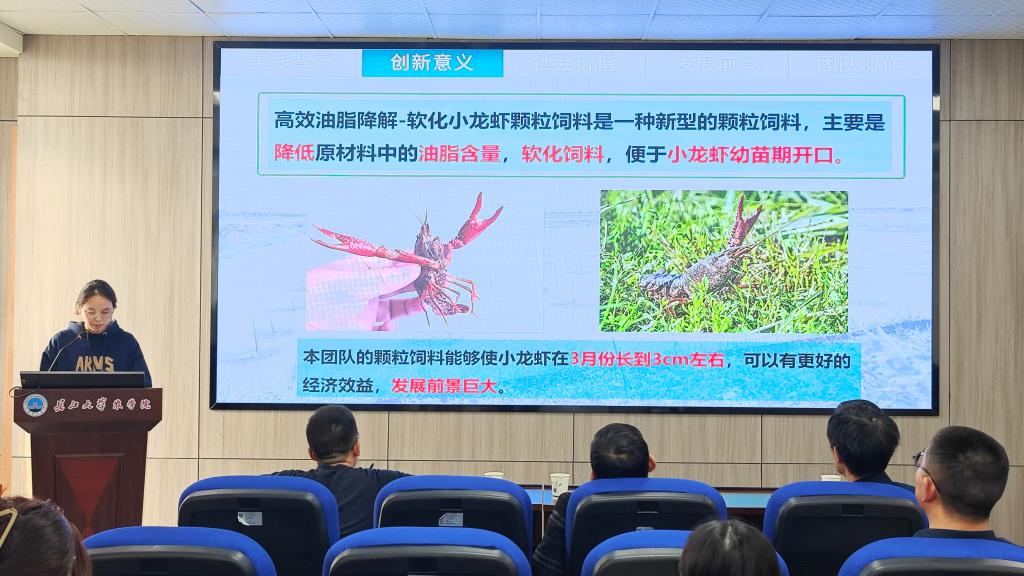 项目三团队呈现他们的高效油脂降解-软化小龙虾颗粒饲料项目。该项目旨在研发一种高效的油脂降解技术,用于生产软化小龙虾颗粒饲料,解决传统饲料生产过程中存在的油脂数量过多、降解不易等难题,提高饲料的品质和营养价值。团队成员用清晰简洁的PPT展示了项目的研究意义、技术路线、实验数据以及市场应用前景,并就项目的技术创新点和实际应用效果做了详细的说明。评委老师们也针对该项目提出了中肯的意见和建议。